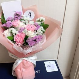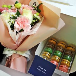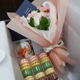 장미,카네이션이 무지 잘 어울리는 예쁜 꽃다발이라 좋아합니다. 달달한 마카롱까지, 좋은 선물입니다.