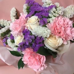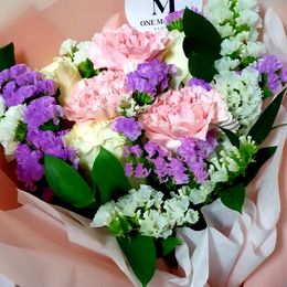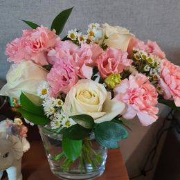 베이비핑크 색감의 다양한 꽃과 하얀 장미가 모여