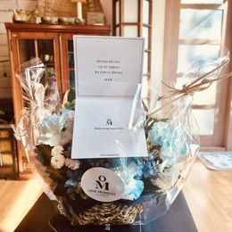 '강한 애정' 이라는 꽃말을 담은 파란 수국 '영원한 행복' 파란색 카네이션 '믿음직한 사랑' 과꽃 '변함없는 사랑' 연보라 스타티스 시원함을 한껏 담기위해 직접 파-란 염색한 콜롬비아 카네이션