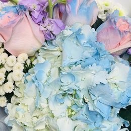 특별한 스프레이를 뿌려 염색한 콜롬비아 수국과 수입장미들로 이루어진