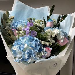 특별한 스프레이를 뿌려 염색한 콜롬비아 수국과 수입장미들로 이루어진